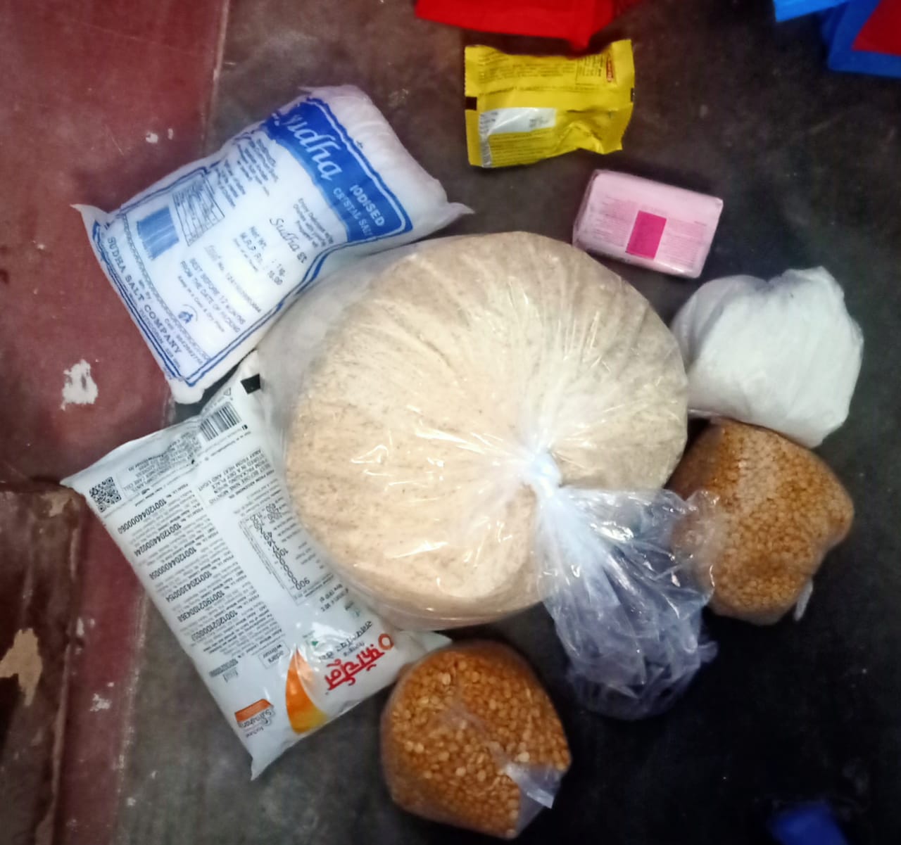 | Rice 5kg/Toor Daal 500gms/Chana Daal 500gms/Oil 1 liter/Tamarind 250gms/Sugar 1kg/Salt 1 Packet/Soap |